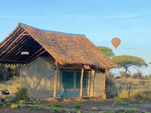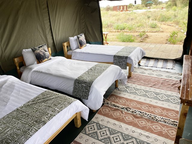 Amboseli Discovery Camp sits between Amboseli National Park and the legendary Mt. Kilimanjaro. The camp, made of Hemingway style Safari tents, allows you to stay far away from the tourists’ crowds. We have everything you desire for peace and tranquility. Unwind and refresh in a luxury glamping tent at the base of Mt. Kilimanjaro, a few steps away from Amboseli National Park. All the tents have a million-dollar view of Mt. Kilimanjaro. The camp has been designed to give guests the feel of a 20th century traditional Safari camp. They have 12 self-contained, Hemingway style Safari tents, under traditional African thatched roof that keeps the tent cool from equatorial heat. Each tent has a covered veranda with classic Safari chairs and table for your comfort. In addition to tents they have two spacious log cabins ideal for family groups.