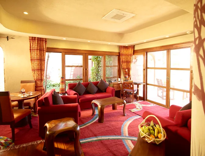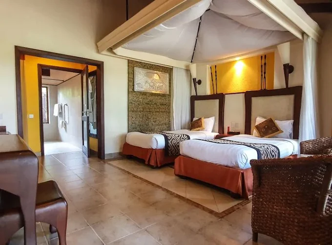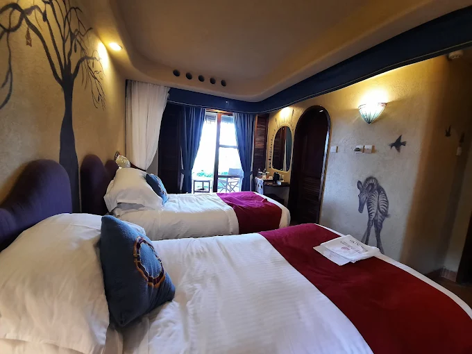 Decorated with local antiques, artefacts and artwork, our two-bedroom family . Room is well equipped with a bedroom with one king bed, a second bedroom with two twin beds, a shared bathroom and private balcony overlooking the majestic grasslands of Amboseli National Park. Set on C103 road inside Amboseli National Park, this laid-back game reserve is 10 km from Noomotio Observation Point. Colourful rooms decorated with local antiques and artwork feature complimentary Wi-Fi and ceiling fans, plus balconies, and tea and coffeemaking facilities. Family rooms and 1 suite are also available.