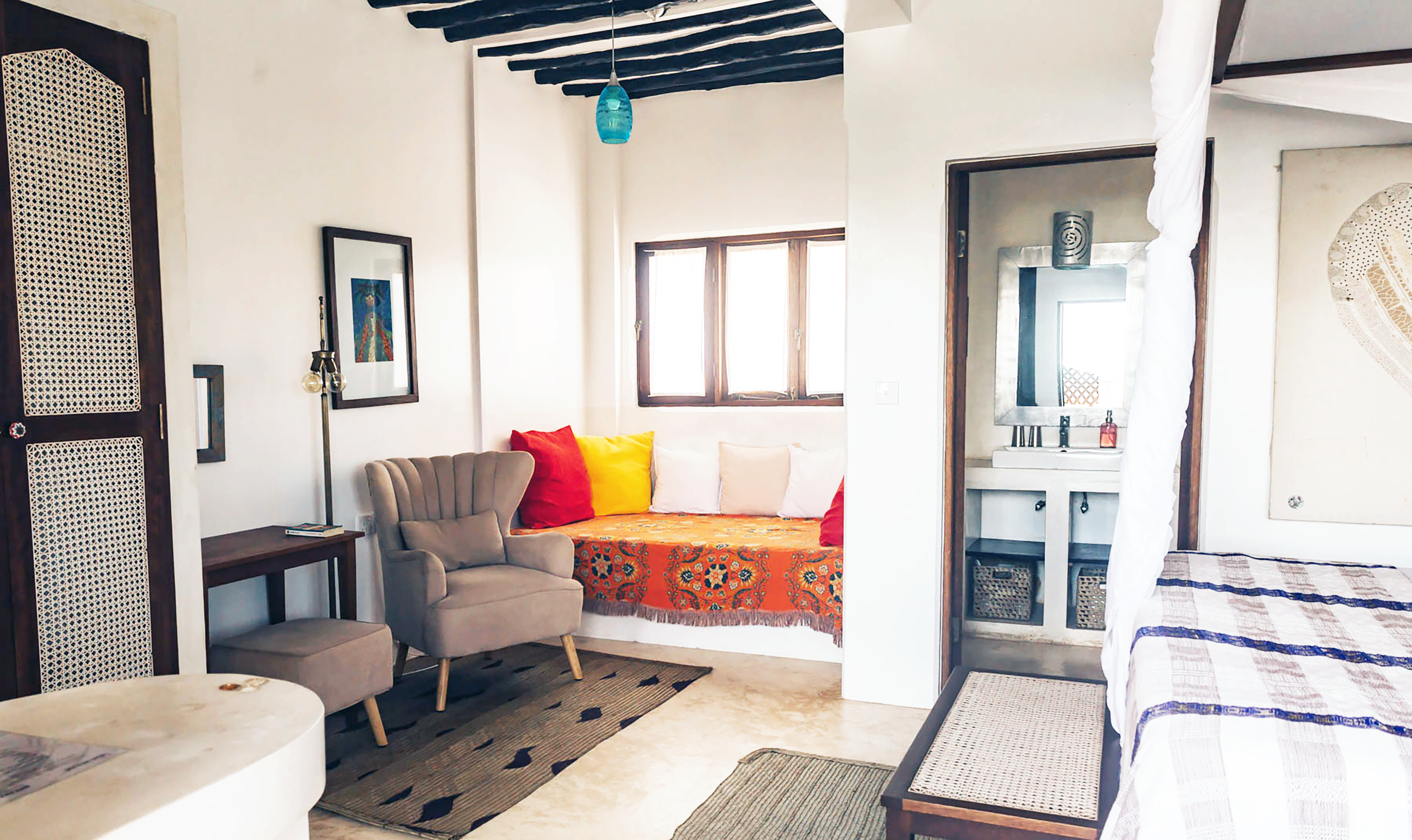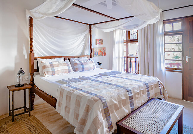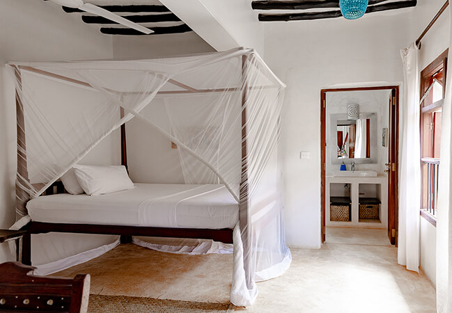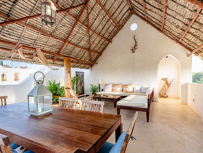 Jua house located in the traditional village of Shella on Lamu island and only a 10 min walk away from the beach. Cleanliness, functionality, comfort, beauty and of course the service to the guests are our main focus, offers five Double Rooms, one Single Room and a Rooftop suite. The double rooms are equipped with king size or twin beds. All rooms have their own private bathrooms with organic products for hair and body. The rooms are on 3 different floors. Each floor has a spacious chill-out space with a breakfast table for six, a fridge and an electric kettle for tea and coffee. There is free Wifi on every floor. The interior design combines traditional Swahili woodcraft, African style and a touch of modern artistry. From the two roof-top terraces one has amazing views to the dunes, the sea and over the islands of Lamu and Manda.