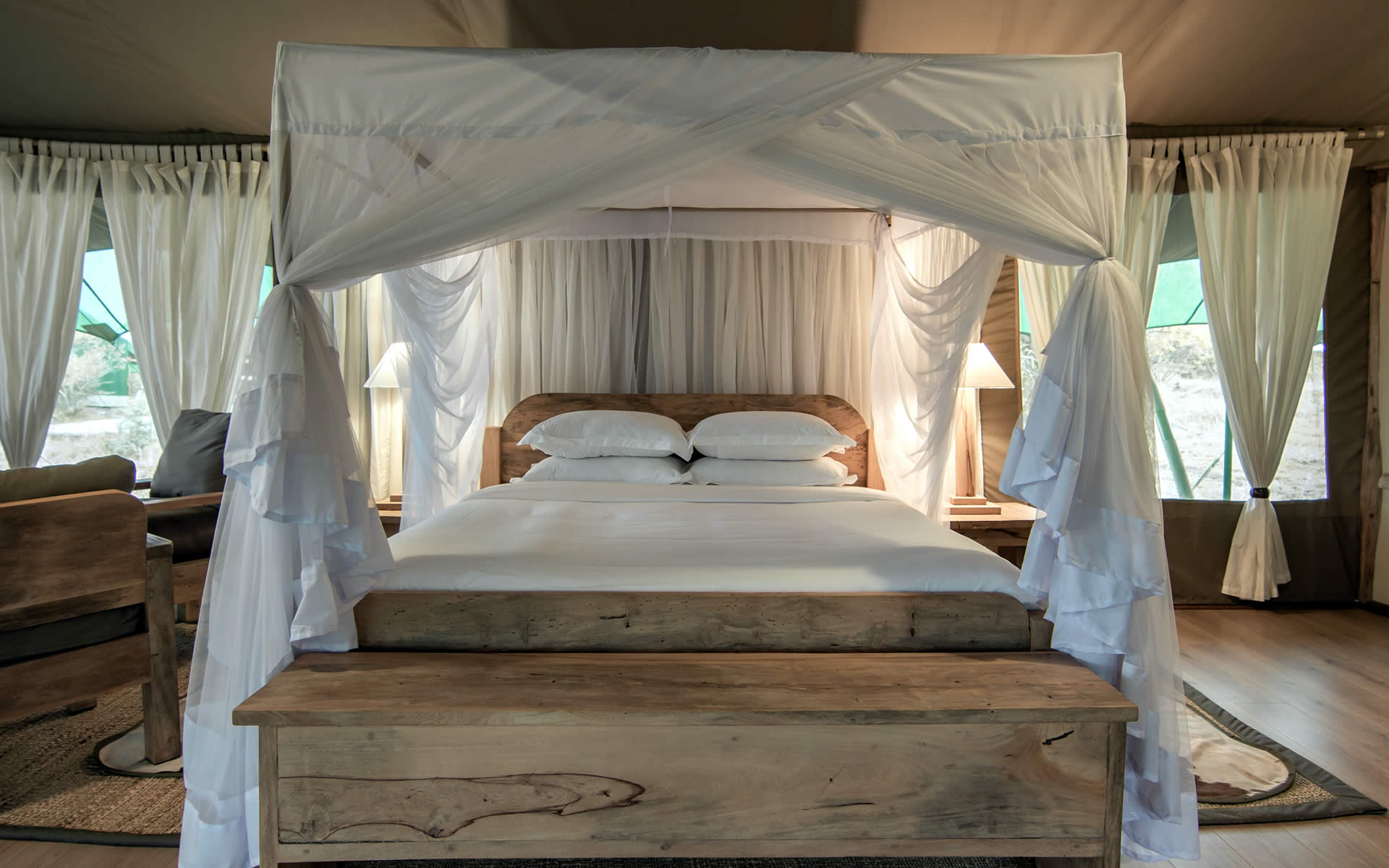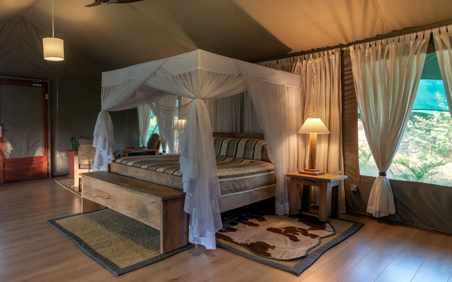 The beds have been custom designed, and are locally made using bush logs. All tents have a flush toilet, hot shower, mosquito nets, clothes rack, carpet, a writing desk and wash basin.
