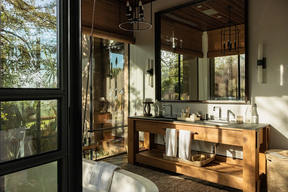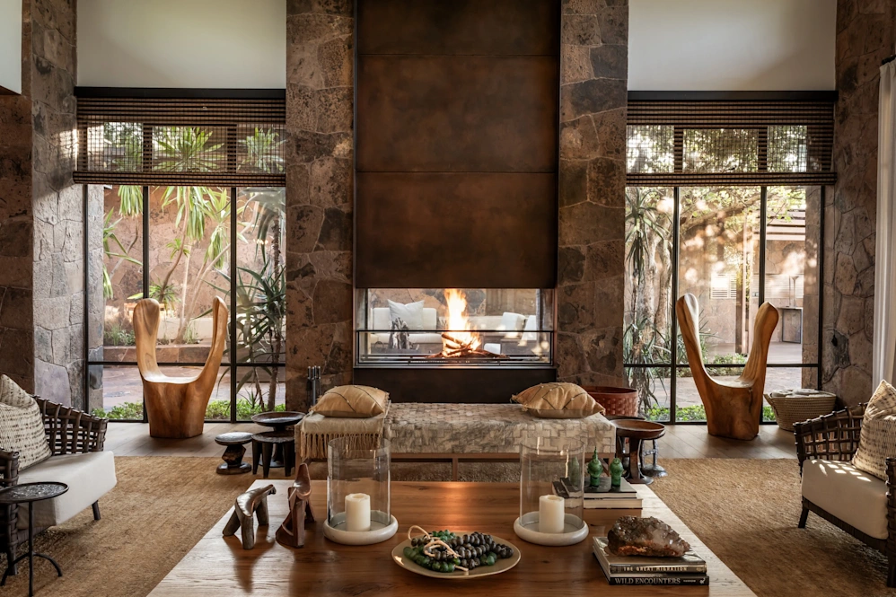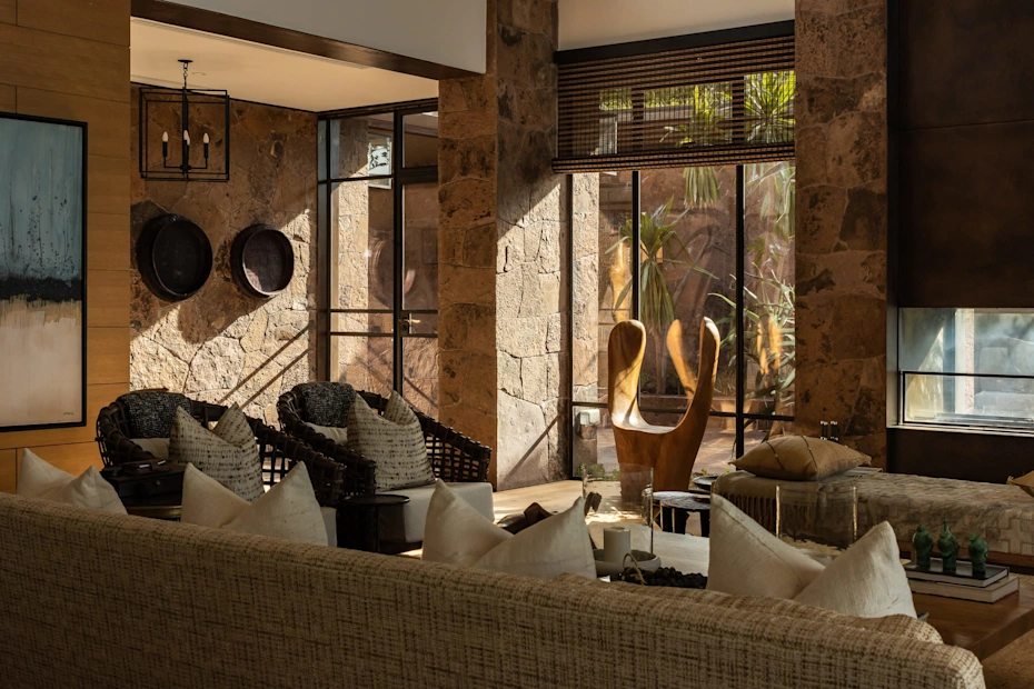 The lodge's modern design blends bold patterns with soft layers and textures inspired by the natural world, giving it a sense of ease and laid-back comfort.
