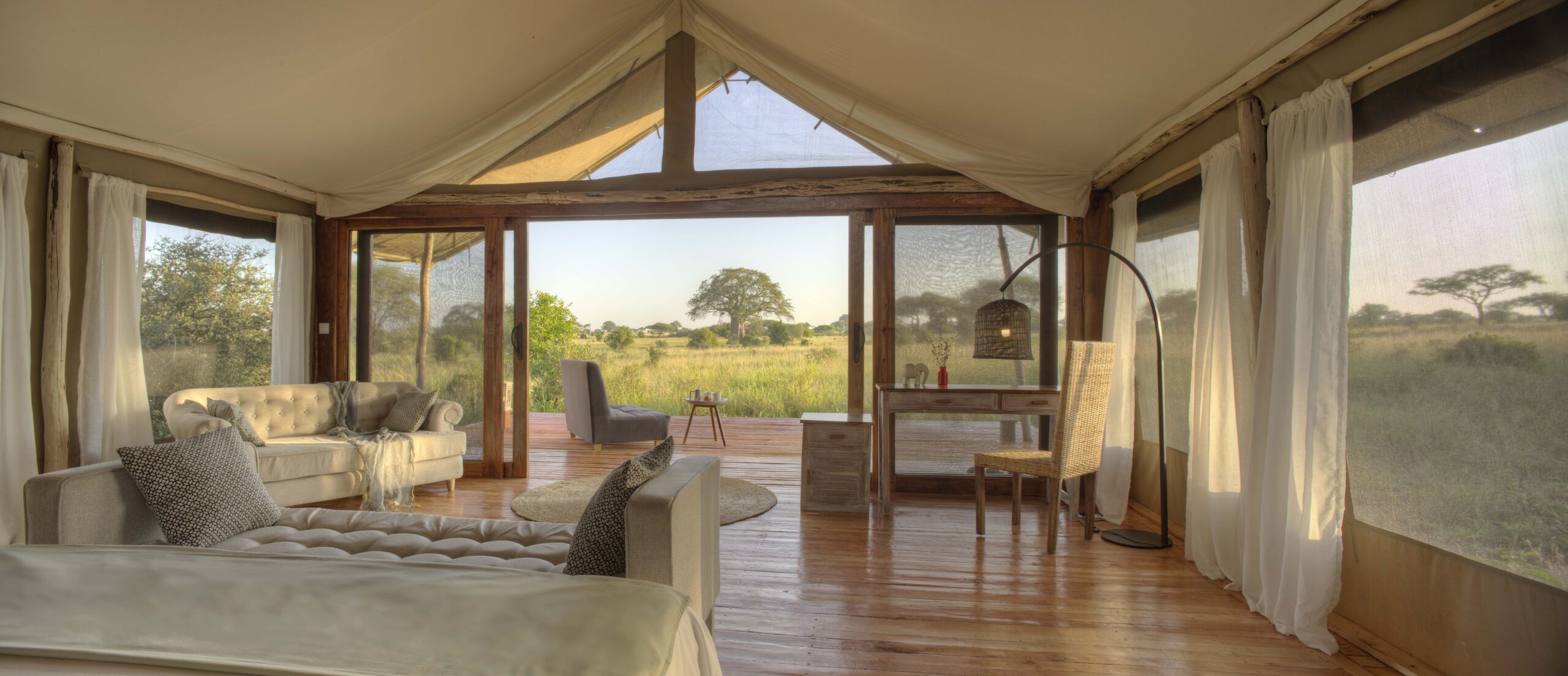 Tarangire Ndovu Tented Lodge sits in the heart of Tarangire National Park, renowned for its vast elephant herds, iconic baobab trees, and untamed wilderness. Open year-round, the lodge provides a perfect base to explore the park, especially during the dry season when wildlife congregates near Tarangire’s vital water sources. The lodge features 12 spacious, permanent tents, including 10 standard suites and 2 family suites with interconnected bedrooms. Each 20m x 8m tent is constructed with locally sourced rip-stop canvas, shaded by cooling cloth, and perched on wooden decks with private balconies offering views of the surrounding bush. Inside, you’ll find handcrafted furnishings, mosquito-netted beds with premium linens, and polished concrete en-suite bathrooms complete with terracotta basins, solar-powered lighting, and eco-friendly amenities