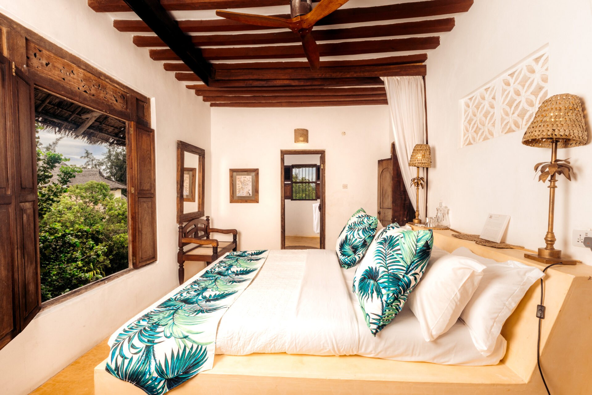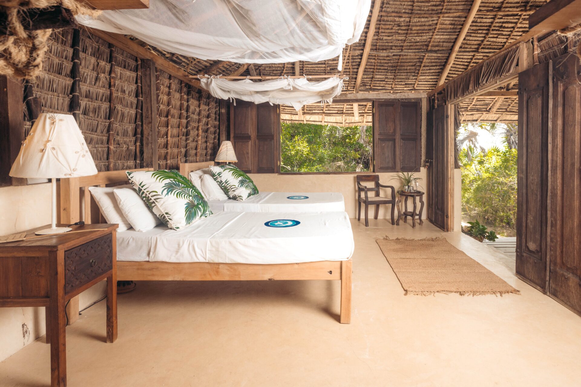 The Cabanas in Lamu offer a variety of room types, including single and double cabanas, with options for families as well. Each cabana features a spacious double bedroom with an ensuite bathroom and a private terrace, some with additional rooms for families. They are designed with natural materials and Swahili antiques, offering a blend of rustic charm and modern comfort. The Cabanas Lamu offers a variety of amenities including Wi-Fi, airport shuttle, a pool, spa, restaurant, laundry service, and a private beach. Additional features include a garden, UV sunbeds, room service, and an outdoor pool. The Cabanas also feature a wellness center for massages and treatments, an elevated yoga shala overlooking the ocean, and a watersports center
