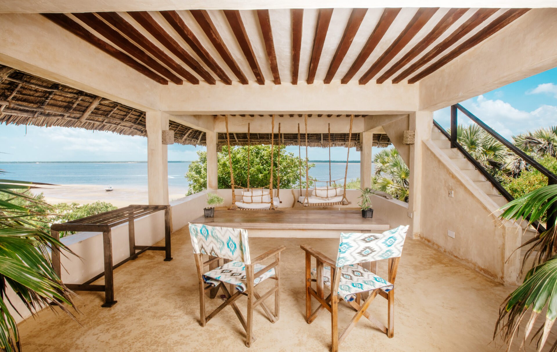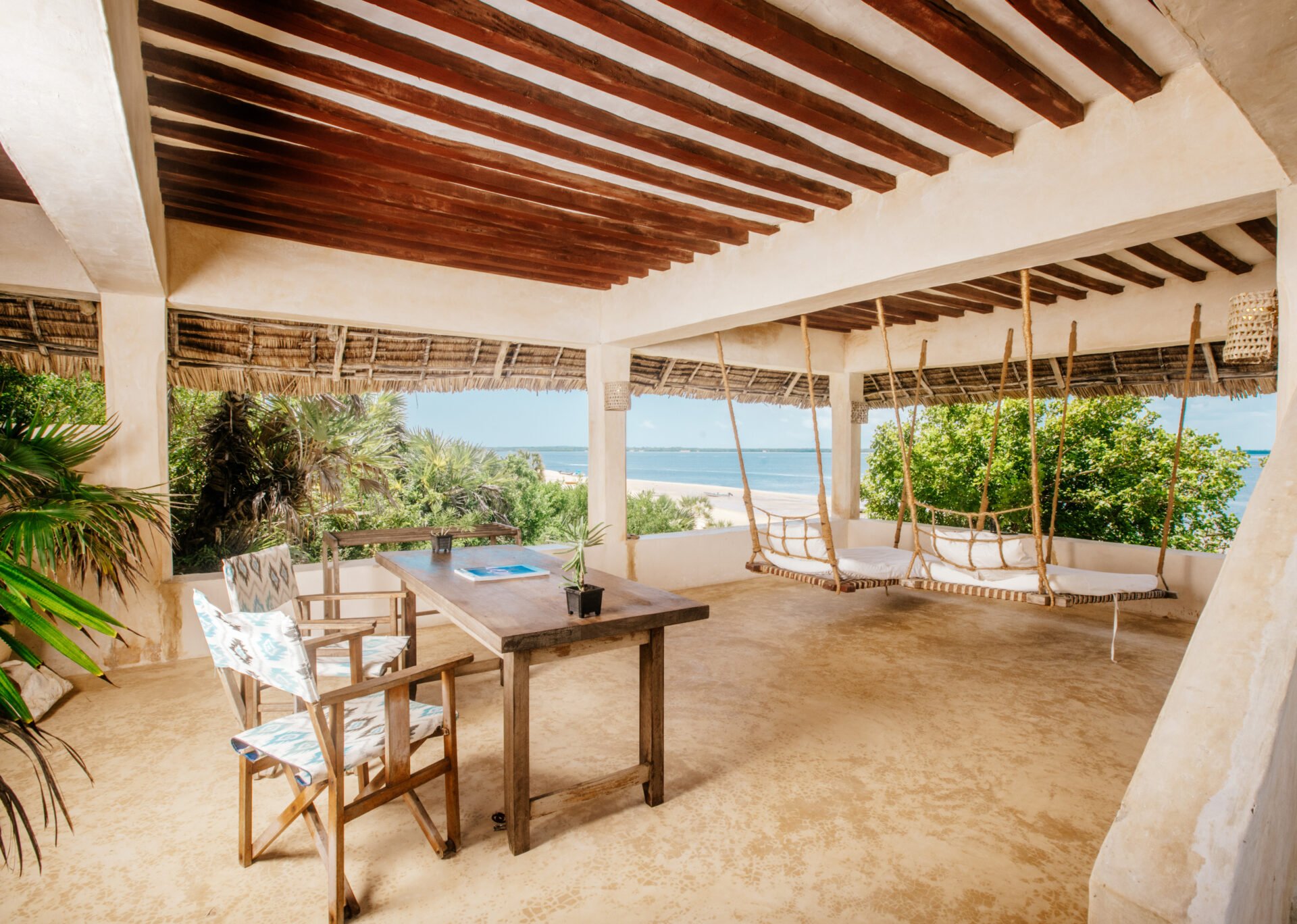 The Cabanas offer cool, comfortable accommodation for families, couples or single travelers – each cabana has its own large netted double bed, bathroom and private terrace: some made entirely of palm thatch, others with elevated coral foundations. Carefully sited to allow for maximum privacy, the cabanas are surrounded by indigenous trees, shrubs and bird song. Sited on a raised sand dune at the center of a long beach, the Cabanas share a fabulous pool and dining area with panoramic views of the channel and the ocean, where chefs will deliver a delicious daily menu. This beachfront sanctuary offers a unique blend of barefoot luxury and personal touches, inviting you to immerse yourself in the peaceful beauty on the South side of Lamu Island.